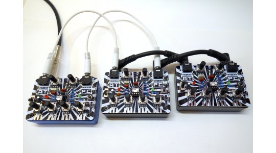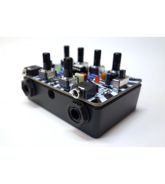 The synth is equipped with 4 potentiometers with body-contacts to tweak the sound. It's powered by center negative plug or 9V battery. You can trigger events by a push-button or via the programmable sync in- or out line. On the output side you'll find a variable lowpass filter and a volume controlled buffer stage to push out true 8bit sound. Because of the parallel 3.5mm and 6.3mm jack plugs you are able to link them in line as well as to interconnect and synchronize with other gear.