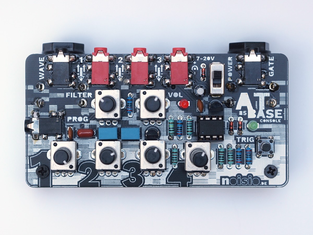 The ATBase is the "next level" ATtiny Punk Console with an extended frequency spectrum into the bass range. Three red 3.5 mm jack sockets replace the body contacts. These can now be used to manipulate the parameters of the first three potentiometers from the outside with control voltages of 0-5V. The supply voltage is fed out via the sockets marked in red using a stereo cable and the modulation signal is fed back at the same time. This allows you to quickly develop and test your own CV circuits (e.g. super simple with 2 components: resistor + light sensor) or connect additional noisio CV modules.
