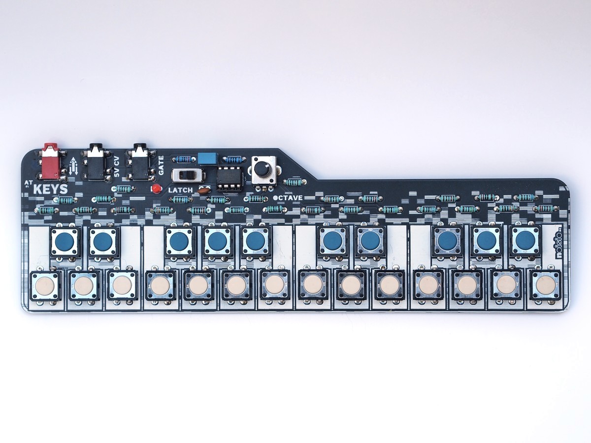 Monophonic 5V Control Voltage Keyboard. The ATKeys module generates 5 octaves as a CV signal with 0-5V = 1V per octave. Two octaves can be selected via the octave potentiometer and are available over 24 keys. When a button is pressed, a gate signal is sent to the output. This can be switched to a continuous signal using the latch switch.