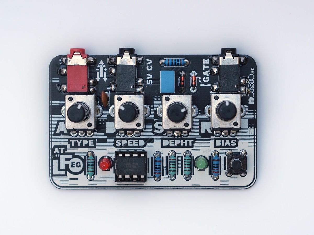 The LFO/EG can be operated as a 5 volt low frequency oscillator or envelope generator. You can set the mode by pressing the button at startup. In LFO-mode 5 waveforms are available: Square, Sine, Triangle, Ramp-Up, Ramp-Down. Furthermore, speed, modulation depth and bias (average value) can be set. As an envelope generator, the module can process the classic parameters attack, decay, sustain and release. The signal can be triggered via the gate input or the button. The LFO/EG can either be connected directly to the noisio synths via the red jack or can be used standalone with any CV capable device and a USB to mini jack adapter.